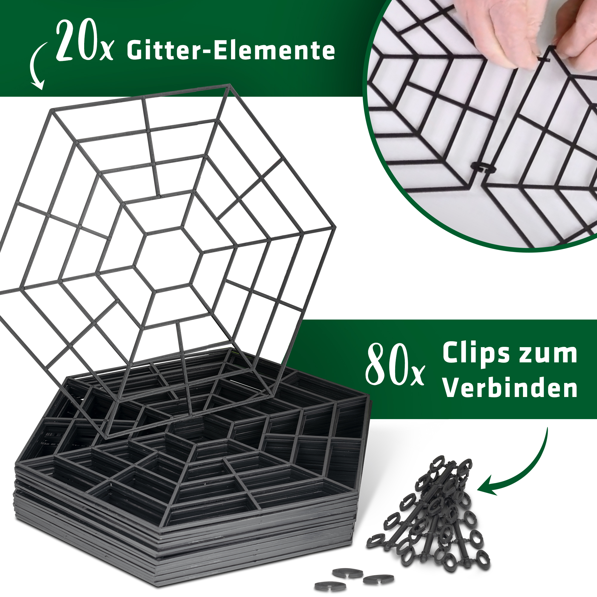 The set contains 20 hexagonal grid modules measuring 31 cm in diameter each and is extendable with additional sets. Clips to connect the modules with each other are included.