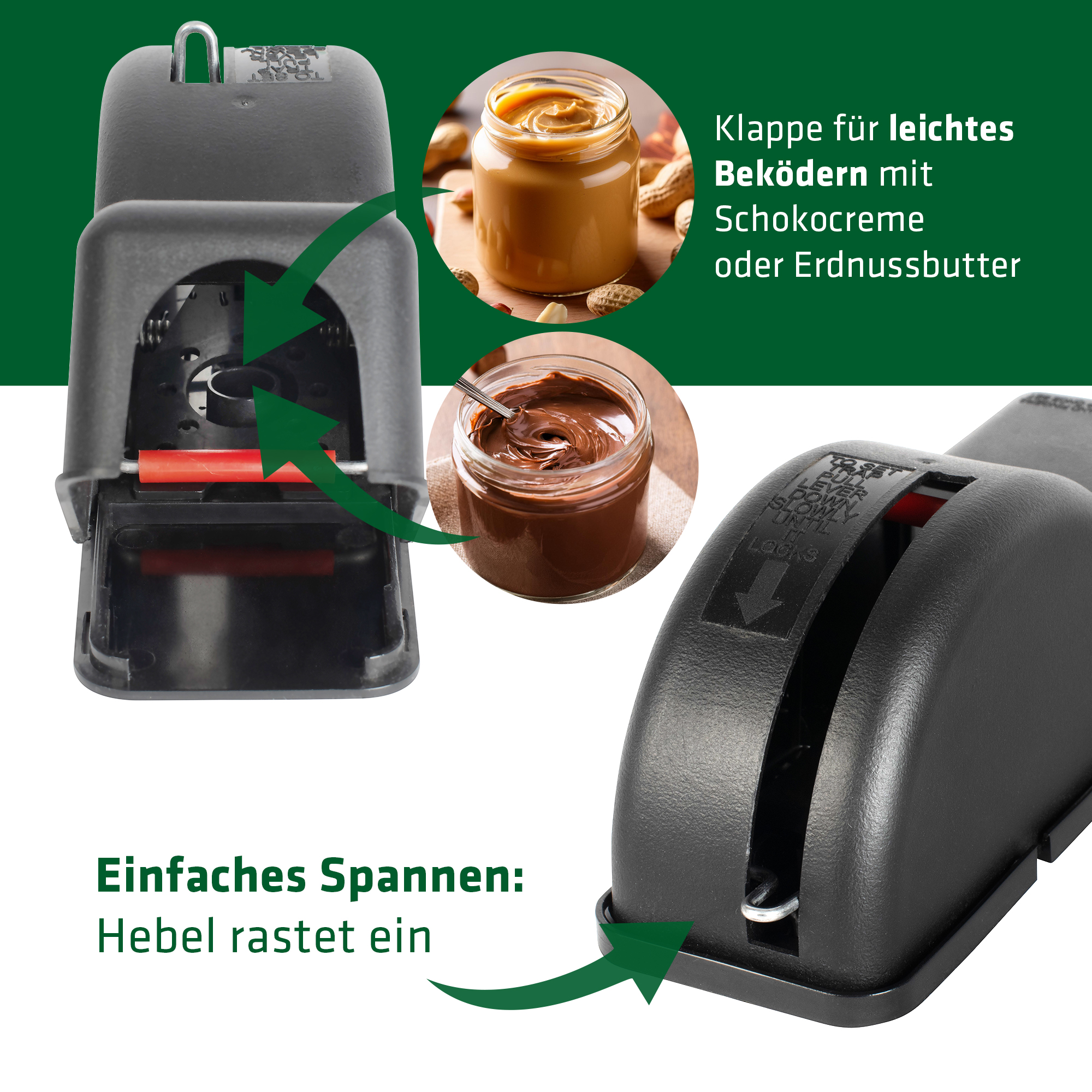 The bait is placed inside by opening the flap at the front. Spreadable baits such as liver sausage, chocolate-hazelnut spread or peanut butter are ideal for this type of trap.