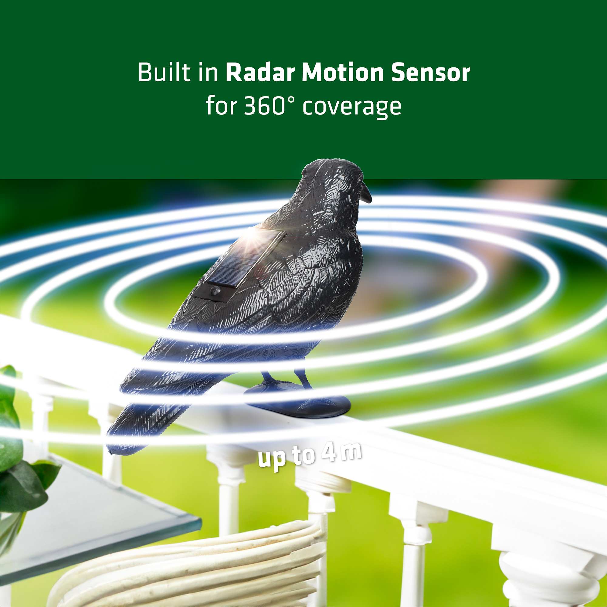 Thanks to the integrated radar motion sensor, the device works from all directions. It is powered by a solar panel. To ensure that neighbors are not disturbed, the pigeon repellent can be switched off at night by pressing a button. Natural sounds like crow calls are also much less disruptive than artificially generated deterrent noises.