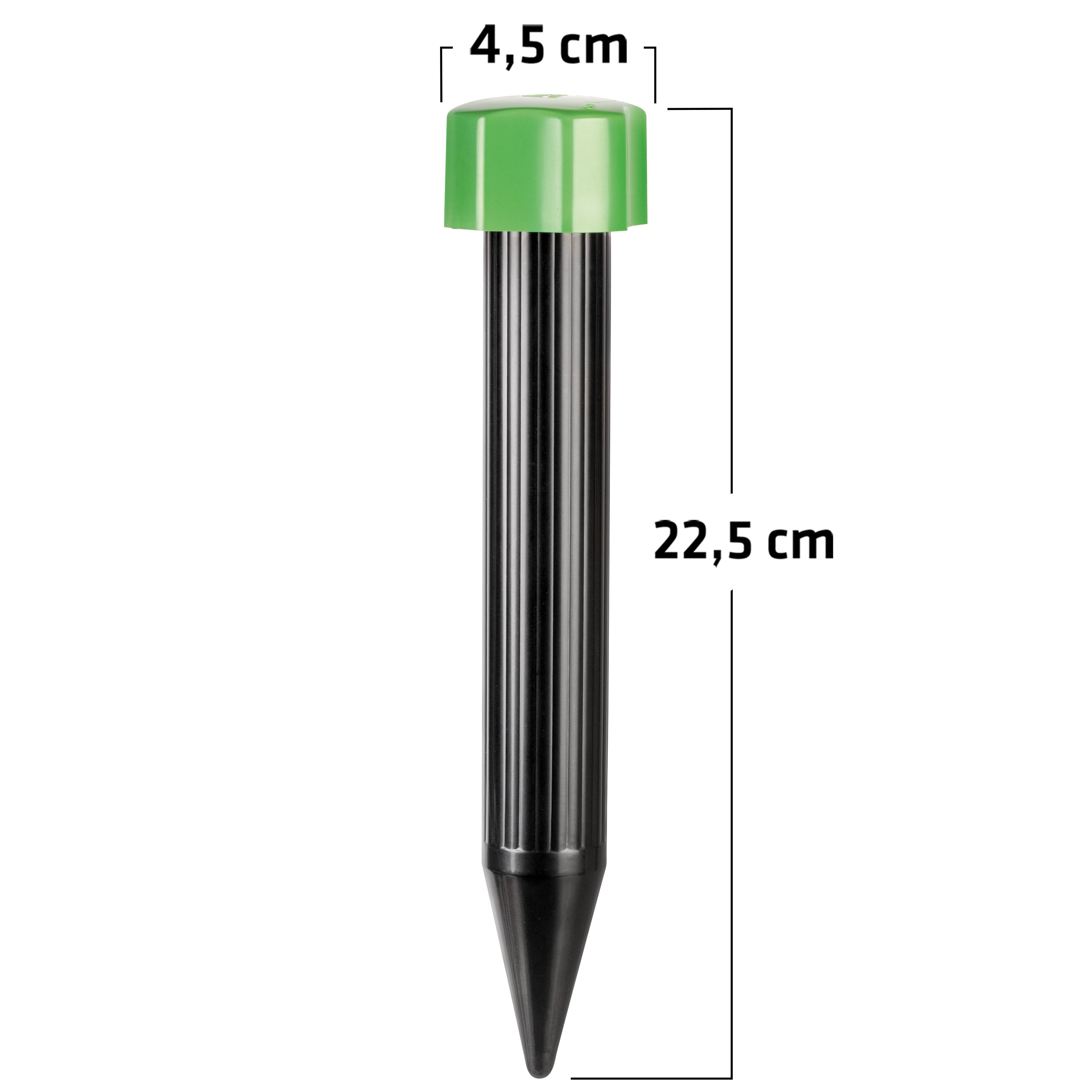 Mole Repellent Mini is the most compact mole repeller by Gardigo. But compact does not equal weak: The buzzer inside the device is just as large and powerful as in many bigger devices. The slim design makes it easier to insert the product into the soil.